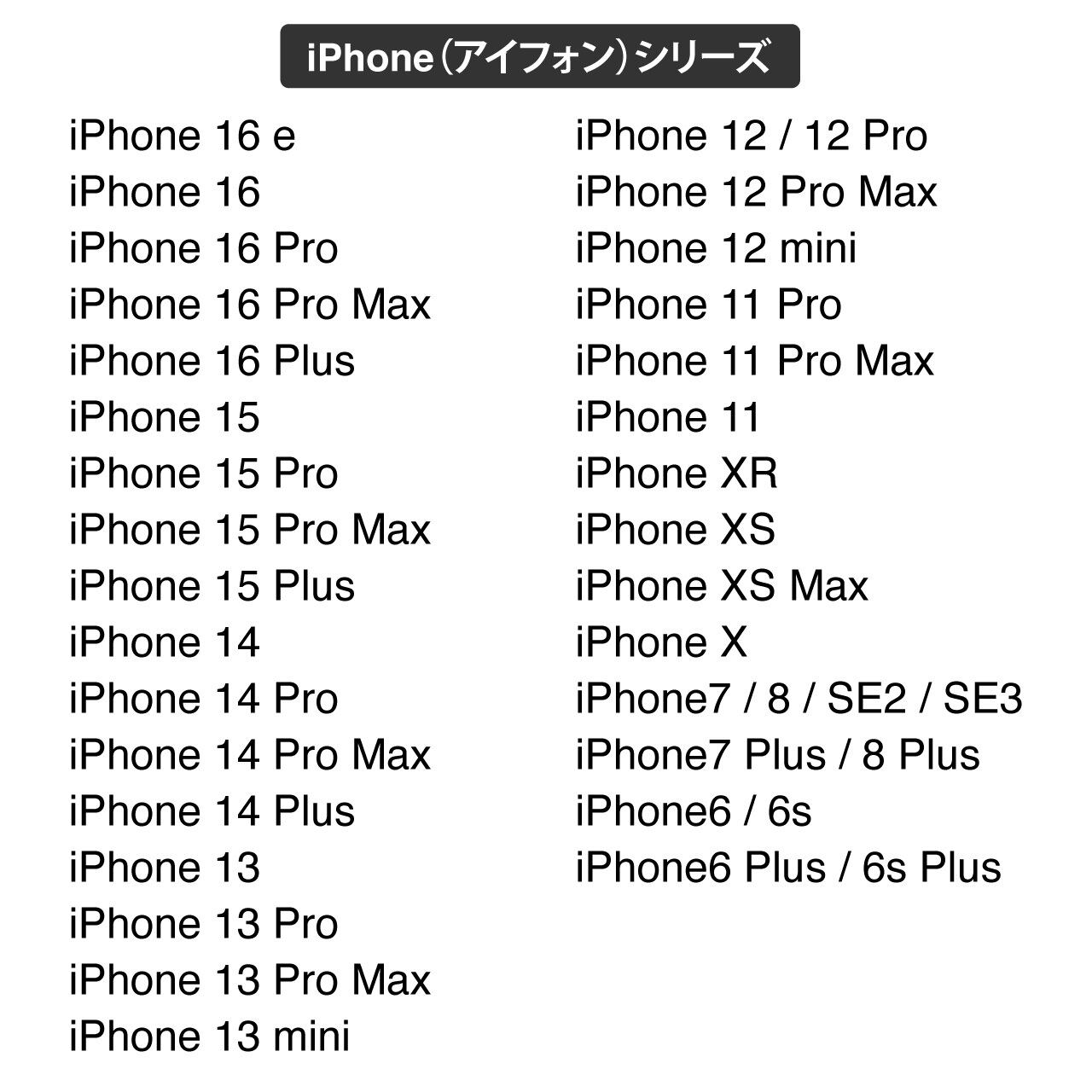 16 e、16 Pro Max、16 Pro、16 Plus、16、15 Pro Max、15 Pro、15 Plus、15、14、14 Pro、14 Pro Max、14 Plus、13 Pro Max、13 Pro、13、13 mini、12/12Pro、12Pro Max、12 mini、11 Pro、11 Pro Max、11、XR、XS、XS MAX、SE3、SE2、8Plus、8、7Plus、7、6S、6