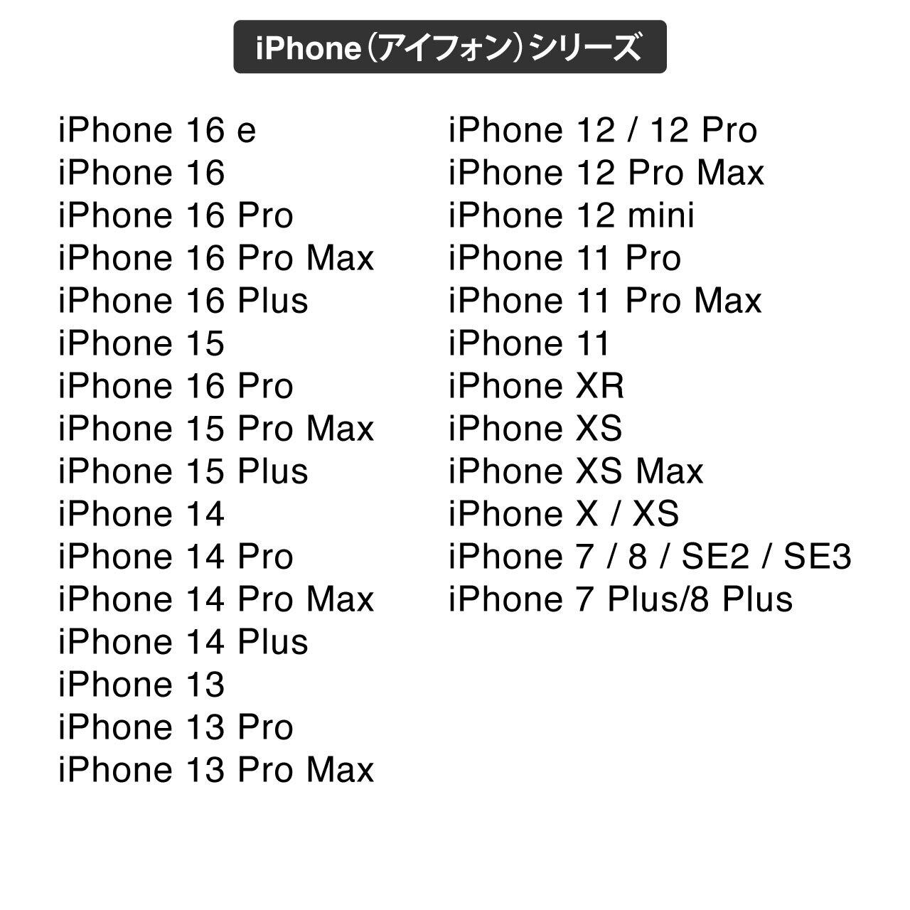 16 e、16 Pro Max、16 Pro、16 Plus、16、15 Pro Max、15 Pro、15 Plus、15、14、14 Pro、14 Pro Max、14 Plus、13 Pro Max、13 Pro、13、13 mini、12/12Pro、12Pro Max、12 mini、11 Pro、11 Pro Max、11、XR、XS、XS MAX、SE3、SE2、8Plus、8、7Plus、7