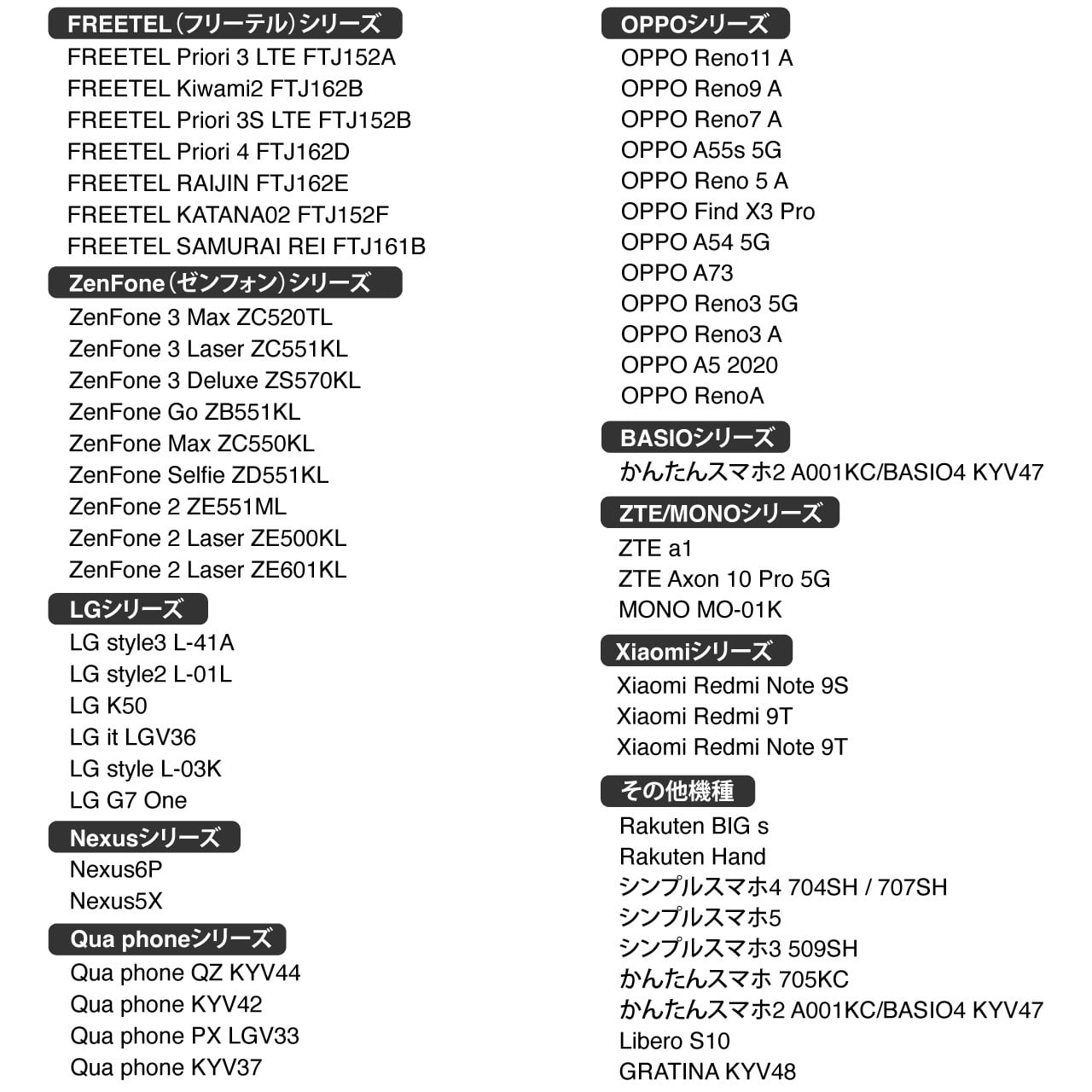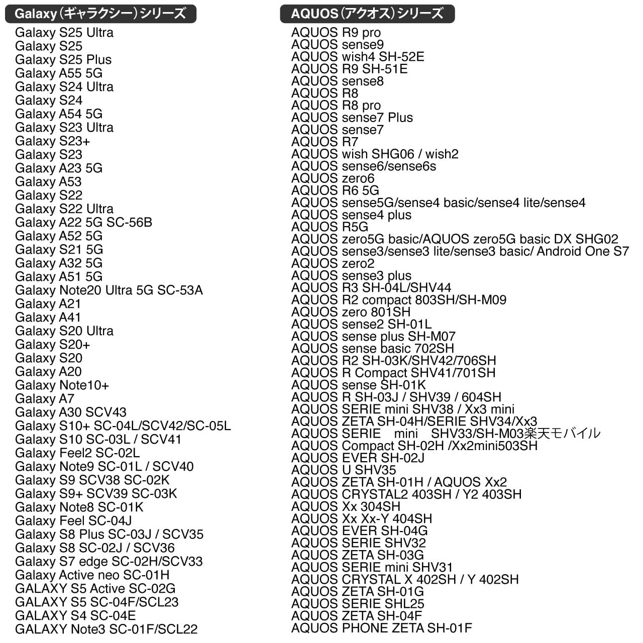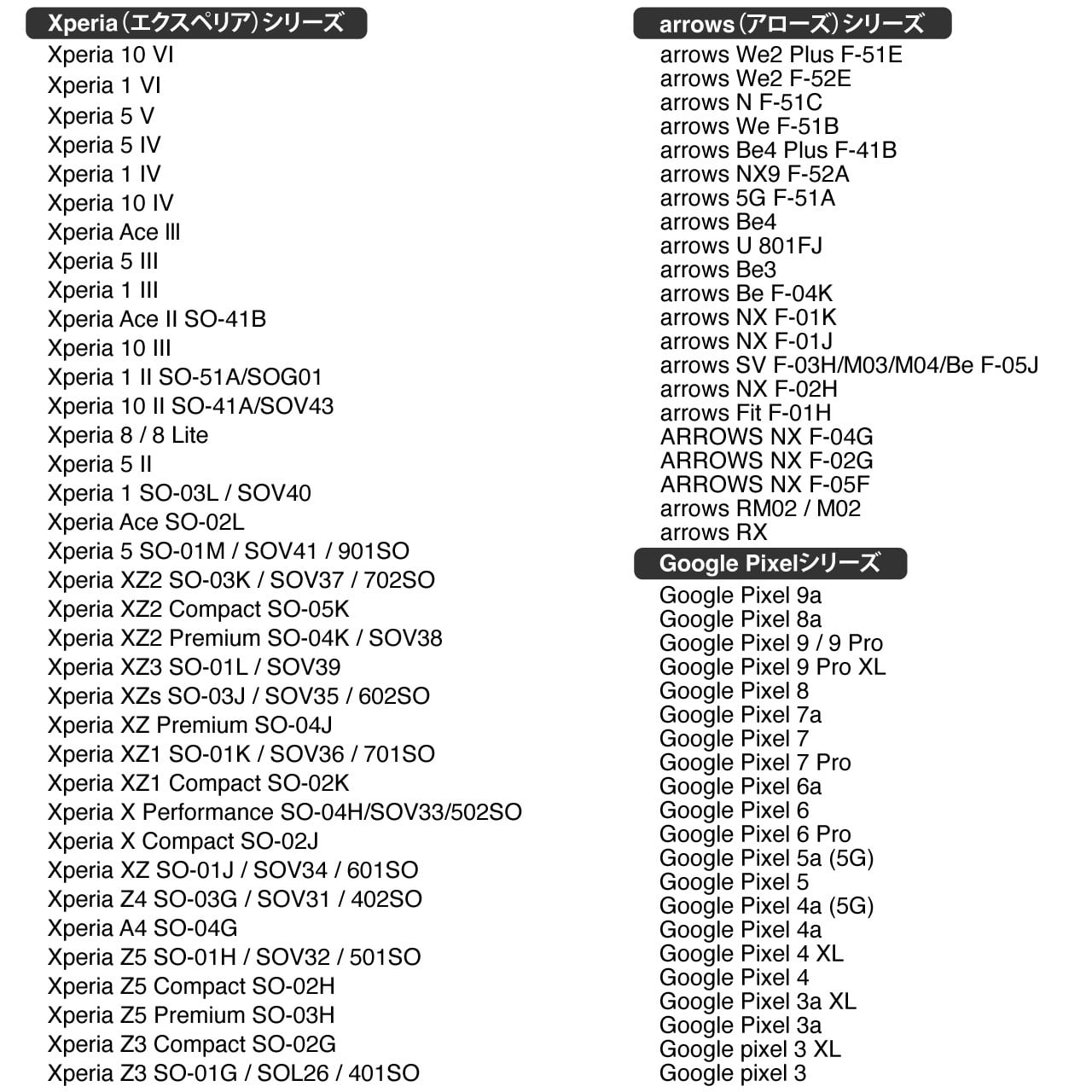 Xperia 10 VI〜、arrows We2 Plus F-51E〜、Google Pixel 9a〜、Galaxy S25 Ultra〜、AQUOS R9 pro〜、Android One S8〜、HUAWEI nova 5T〜、Xiaomi Redmi Note 9S〜、OPPO Reno11 A〜、LG style3 L-41A〜
