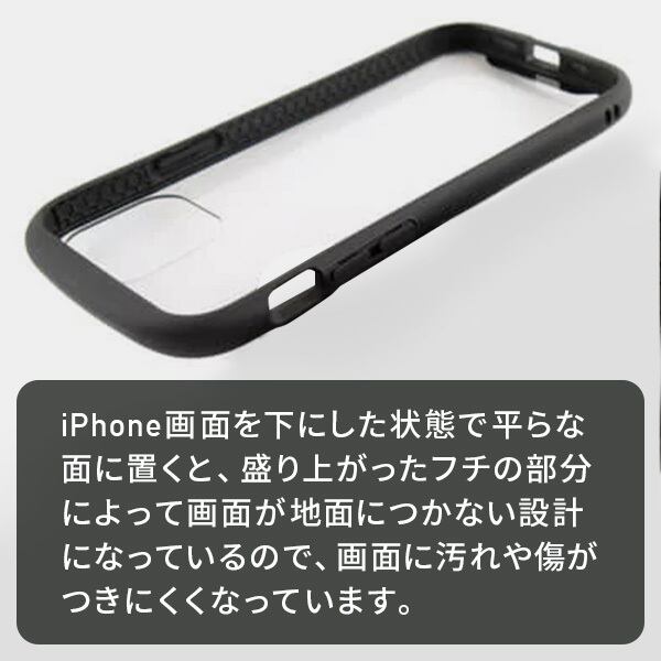 iPhone画面を下にした状態で平らな面に置くと、盛り上がったフチの部分によって画面が地面につかない設計になっているグリップケース。