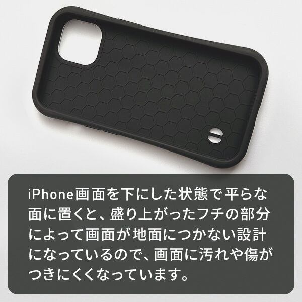 iPhone画面を下にした状態で平らな面に置くと、盛り上がったフチの部分によって画面が地面につかない設計になっているグリップケース。