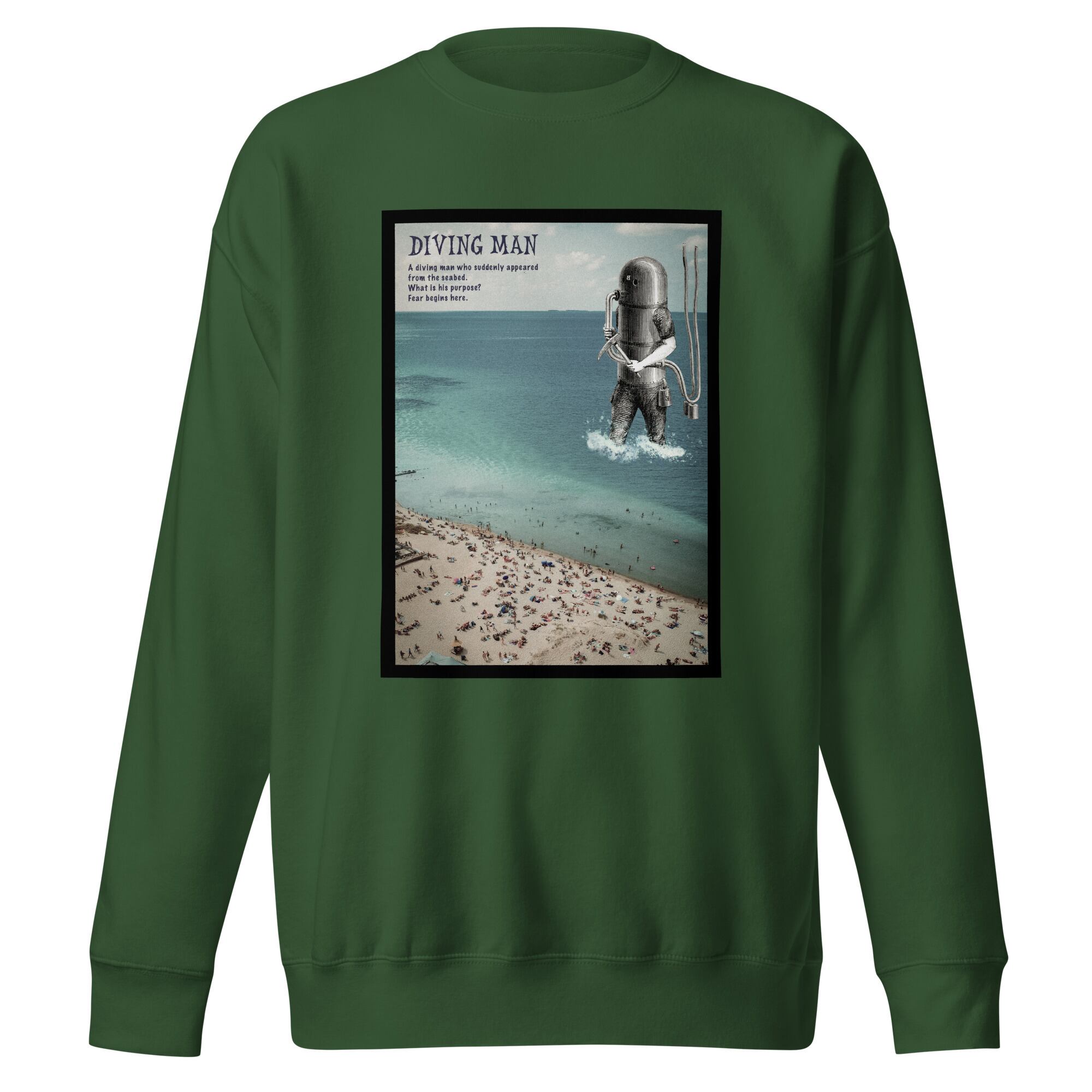 写真とイラストを組み合わせた個性的なB級映画風デザインが特徴の、ユニセックスで着られる8.5オンスのダイビングマンスウェットシャツ。